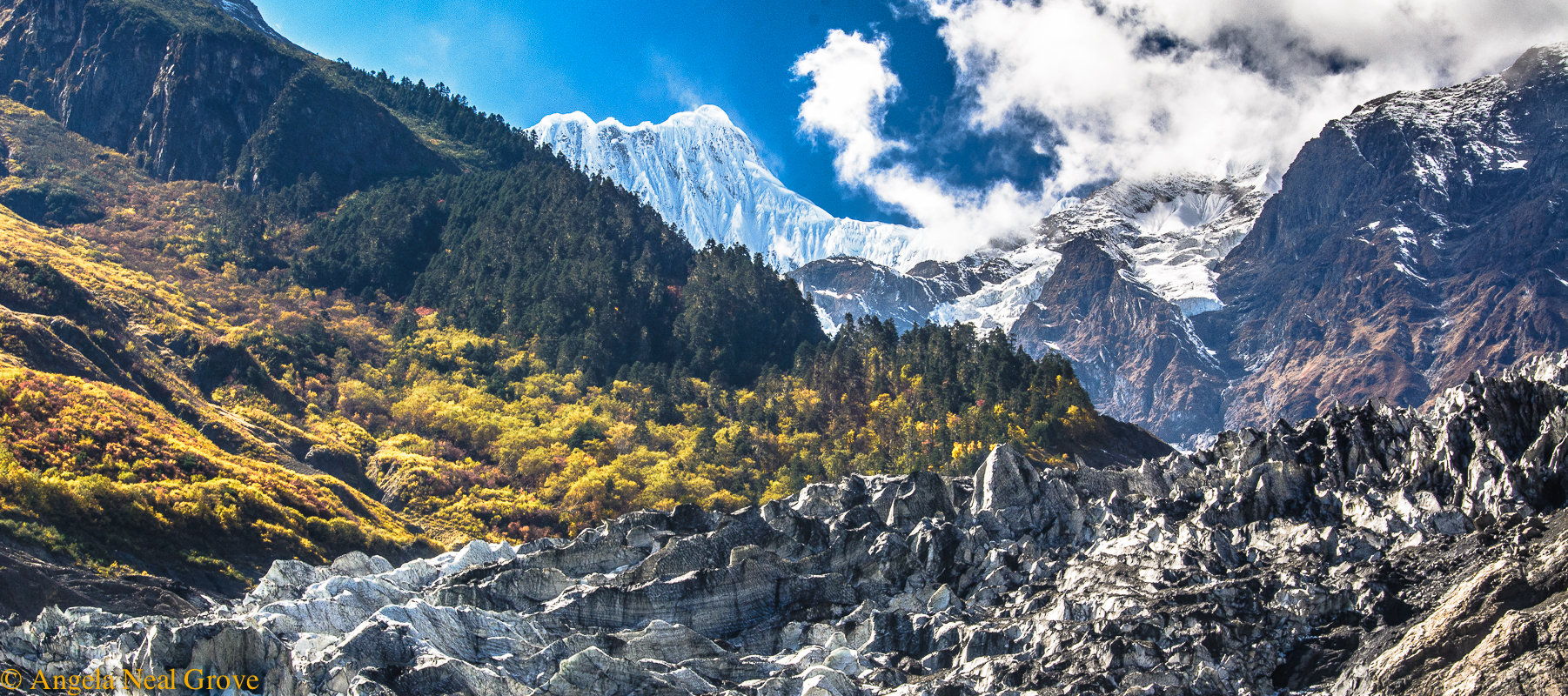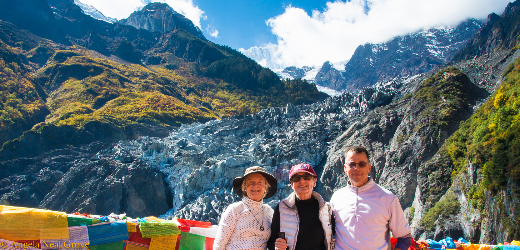 From the base we hiked with pilgrims up the rocky trail through forests to the foot of glaciers and ice walls at 12,000 ft where we had a picnic lunch. It was steep, in one section we climbed 1,000 ft in one mile, according to My Altitude. Prayer flags fluttered among the trees and on small shrines. “Tashi Delek” was the greeting as we met pilgrims, the Tibetan equivalent of Namaste.