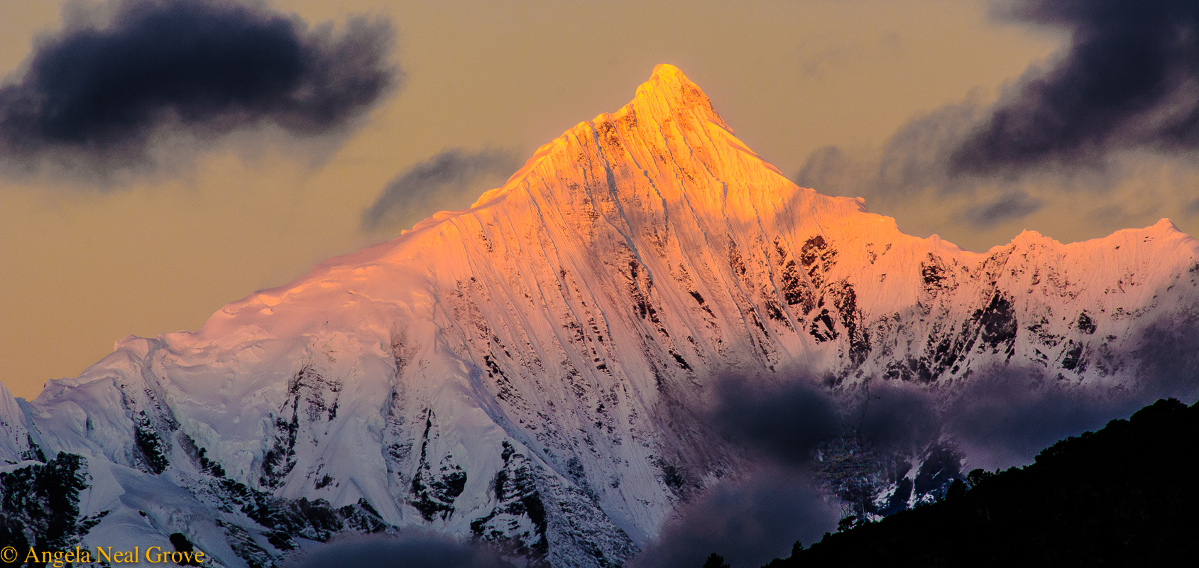 Clutching a mug of hot ginger tea I stood on the roof of the lodge waiting for sunrise. The mountains were crystalline against a purple backdrop. Could anything be more beautiful? Then magically the very tip of Mt. Kawagebo shone golden. As I attempted to capture the beauty it shone a deeper gold. Light washed pink, purple and silver across the glaciers and snow fields. I was spellbound. It was a Shangri-La moment.