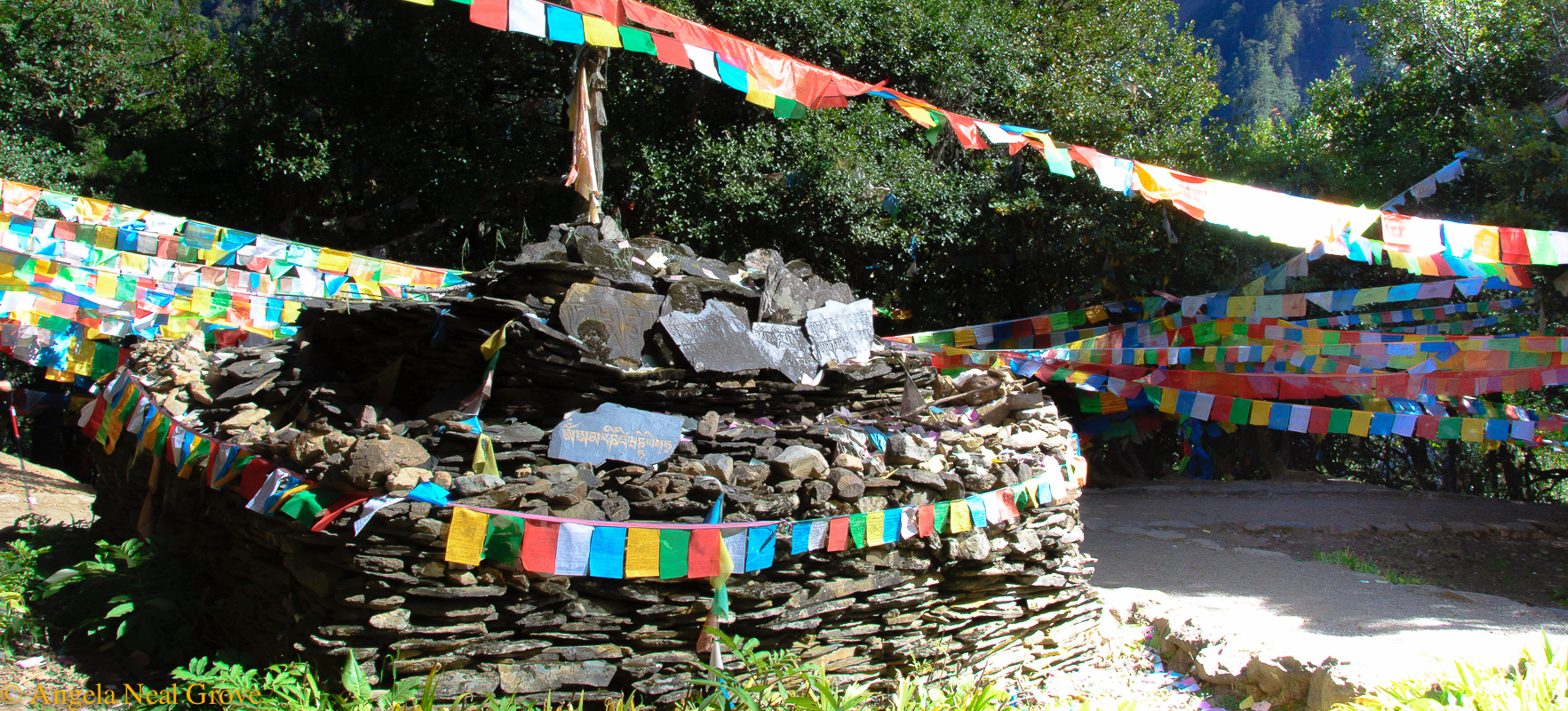 There were swaths of rhododendron and azaleas, iris grew by the stream and in meadows cobalt alpine gentians. The only sounds were rushing water – the trail followed a stream – call of a bulbul bird in a pine tree, and as we neared the village the rhythmic clinking of yak bells